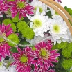 Уменьшенная: хризантема кустовая зеленая - 3 шт, хризантема кустовая белая - 3 шт, хризантема кустовая фиолетовая - 3 шт, декоративная зелень, корзина малая, оазис,