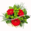 Уменьшенный: хризантема кустовая зеленая - 3 шт, гербера красная - 2 шт, салал, натуральная сетка.
