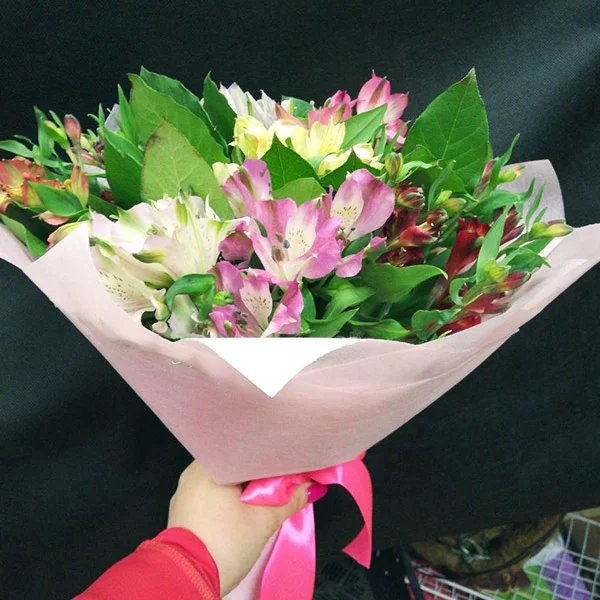 ДЕЛЮКС: эустома розовая - 6 шт., эустома фиолетовая - 6 шт., эустома белая - 5 шт., альстромерия розовая - 11 шт., альстромерия белая - 5 шт.,фетр светло-фиолетовый. Примерный диаметр букета 50х50 см.
