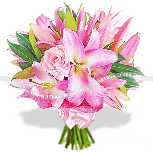 ЛЮКС: лилия розовая (возможна замена на белую) - 3 шт., роза розовая - 7 шт., салал, натуральная упаковка - розовая.