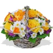 Уменьшенный: роза желтая - 5 шт, хризантема кустовая ромашковая (белая) - 3 шт, альстромерия фиолетовая - 1 шт, статица - 1 шт, декоративная зелень, оазис, корзина.