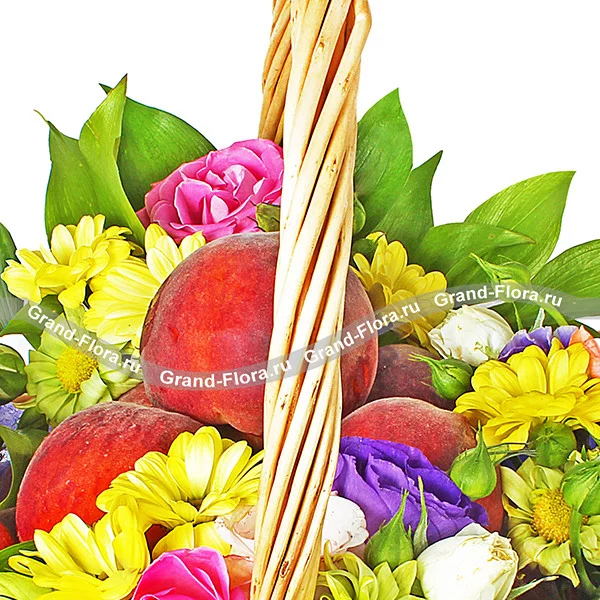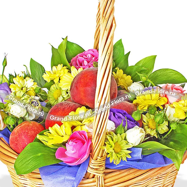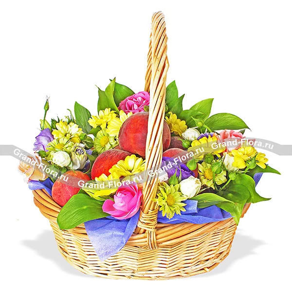 Стандартный: роза розовая (мелкий бутон)- 3 шт., хризантема мелкоцветная зеленая - 1 шт., хризантема кустовая желтая - 2 шт., эустома фиолетовая - 1 шт., роза кустовая белая - 1 шт., рускус - 2 шт., оазис, фетр синий, корзина средняя, персики - 1,5 кг.