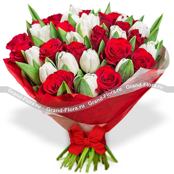 Букет собран из насыщенно – красных роз сорта Grand Prix, отличающихся особенным глубоким красным оттенком, а так же белых тюльпанов ранних сортов. Сочетание наполнено чувственными мечтами, в фетре созвучного красно – белого цвета, подвязанного красным бантом. Высота букета до 40 см, а диаметр от 20 до 35 см в диаметре, в зависимости от варианта, который Вы выберете. Композиция представлена в четырех вариантах: уменьшенный, стандартный, люкс и делюкс. Обращаем Ваше внимание, что состав и оформление букета может отличаться.