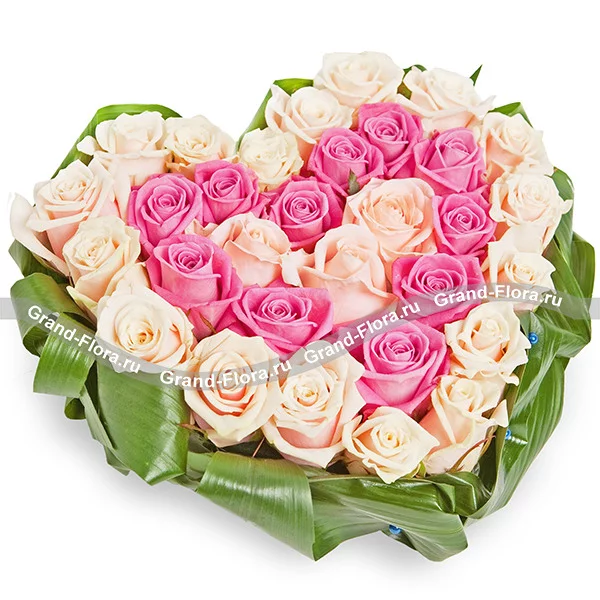 31 роза: роза кремовая - 20 шт., роза розовая - 11 шт., лист аспидистры - 7 шт., оазис большое сердце, декор.