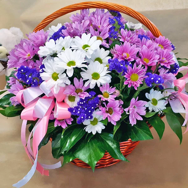 Стандартный: хризантема белая кустовая ромашковидная - 3 шт., хризантема розовая кустовая ромашковидная - 6 шт, статица - 6 шт., декоративная зелень, оазис, корзина средняя.