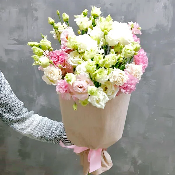 Стандартный: эустома розовая - 7 шт., эустома белая - 4 шт., декоративная зелень, упаковка крафт, лента розовая.