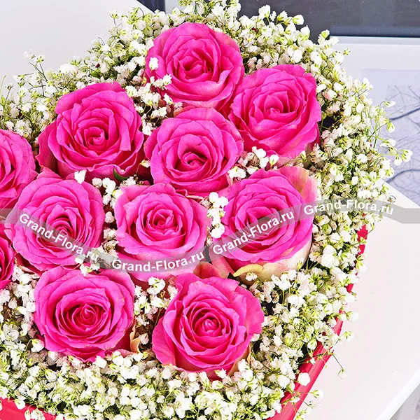 11 роз (на фото): роза розовая - 11 шт., гипсофила, оазис сердце малое. Примерный размер: 25Х25 см.