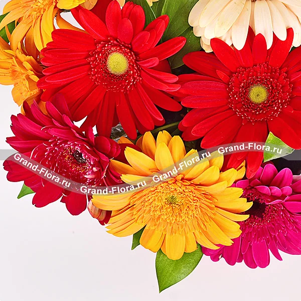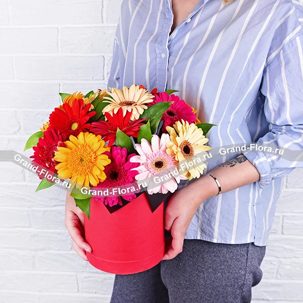 Стандартный: гербера микс - 17 шт., декоративная зелень, оазис, коробка.