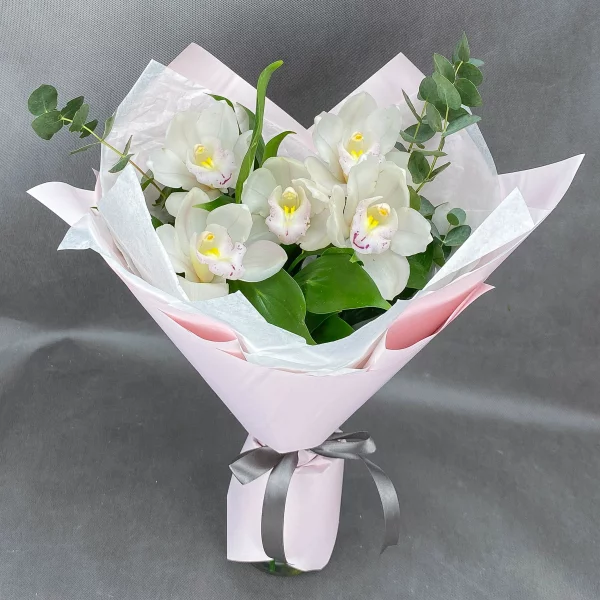 Стандартный: орхидея белая - 5 бутонов, эвкалипт, упаковка.